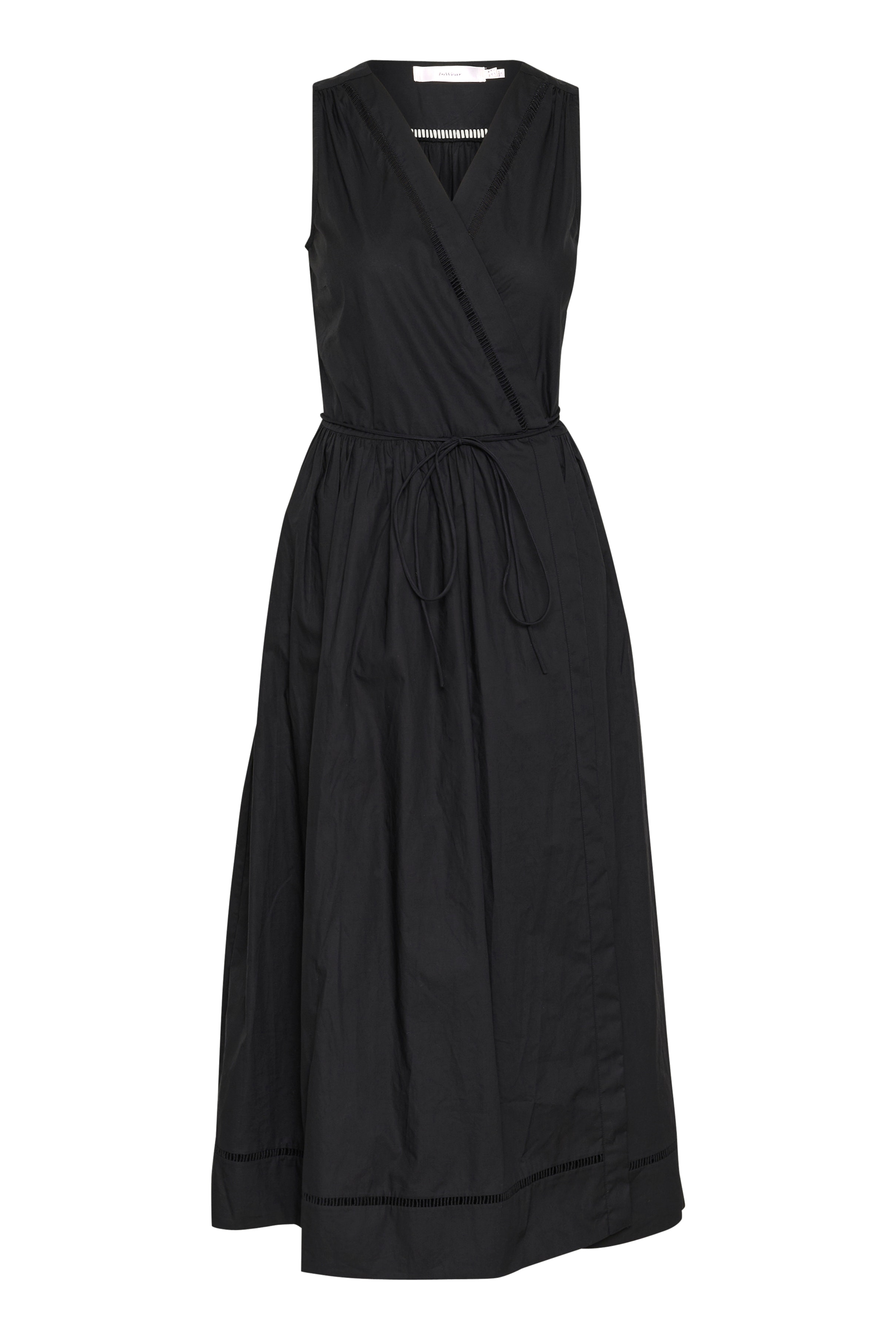 Sleeveless dress in light blue poplin with a wrap-effect front and embroidered trim along the neckline. Designed with a tie belt at the waist and a gently flared skirt with volume and side pockets. An airy, feminine summer dress in crisp cotton. The model is 176 cm tall and wears size 36/S.