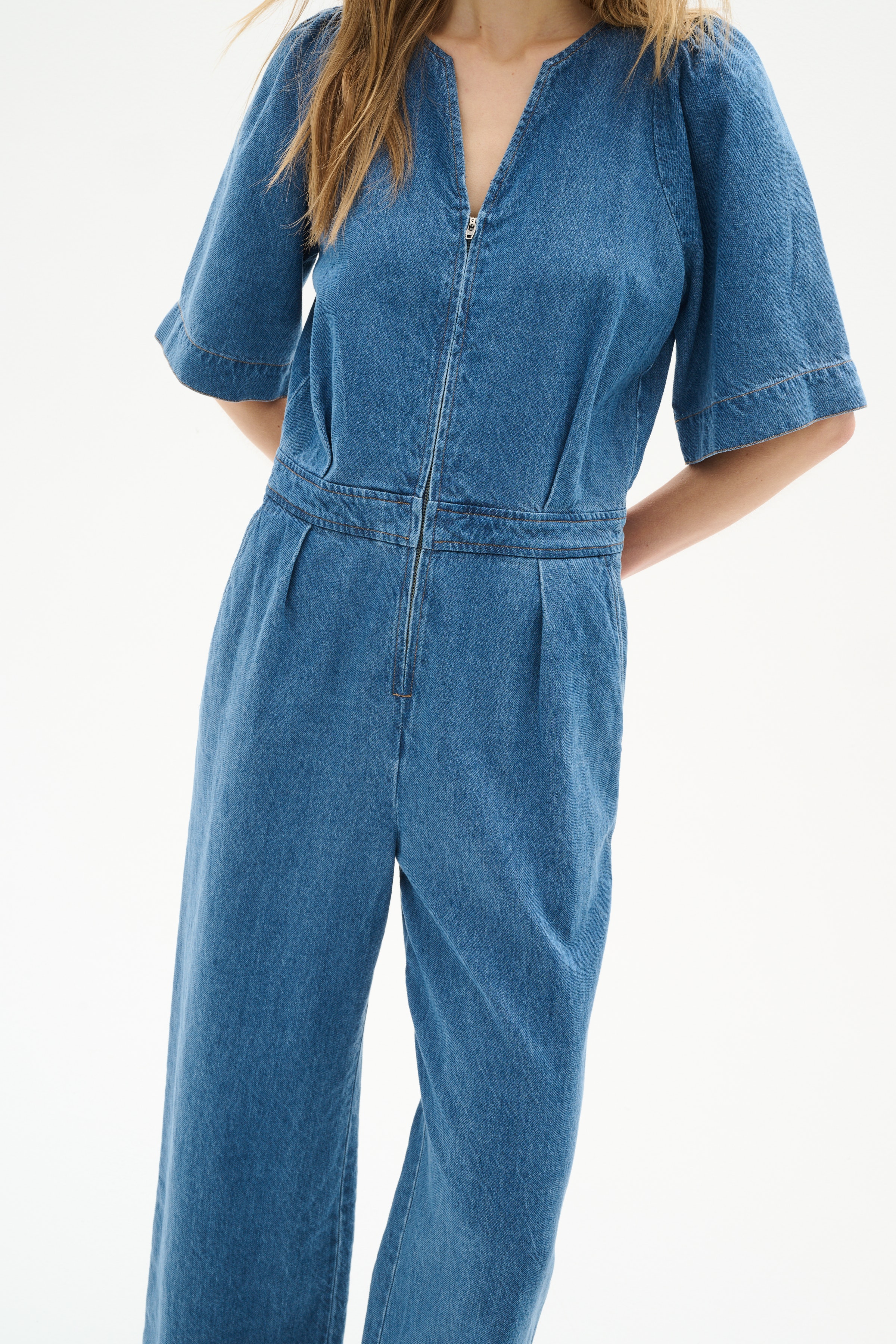 Kortermet jumpsuit i vasket blå denim med glidelås foran, innsvinget midje og rett passform i bena. Designet med V-hals, sidelommer og markerte sømmer som fremhever silhuetten. Laget i strukturert bomullsdenim. Modellen er 176 cm høy og har på seg størrelse 36/S.